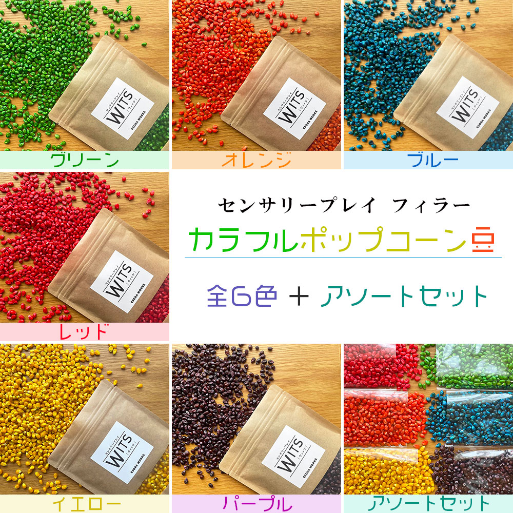 見ているだけでワクワクする6色のカラフルポップコーン豆のフィラーと、全6色をまとめたアソートセットを販売しています。